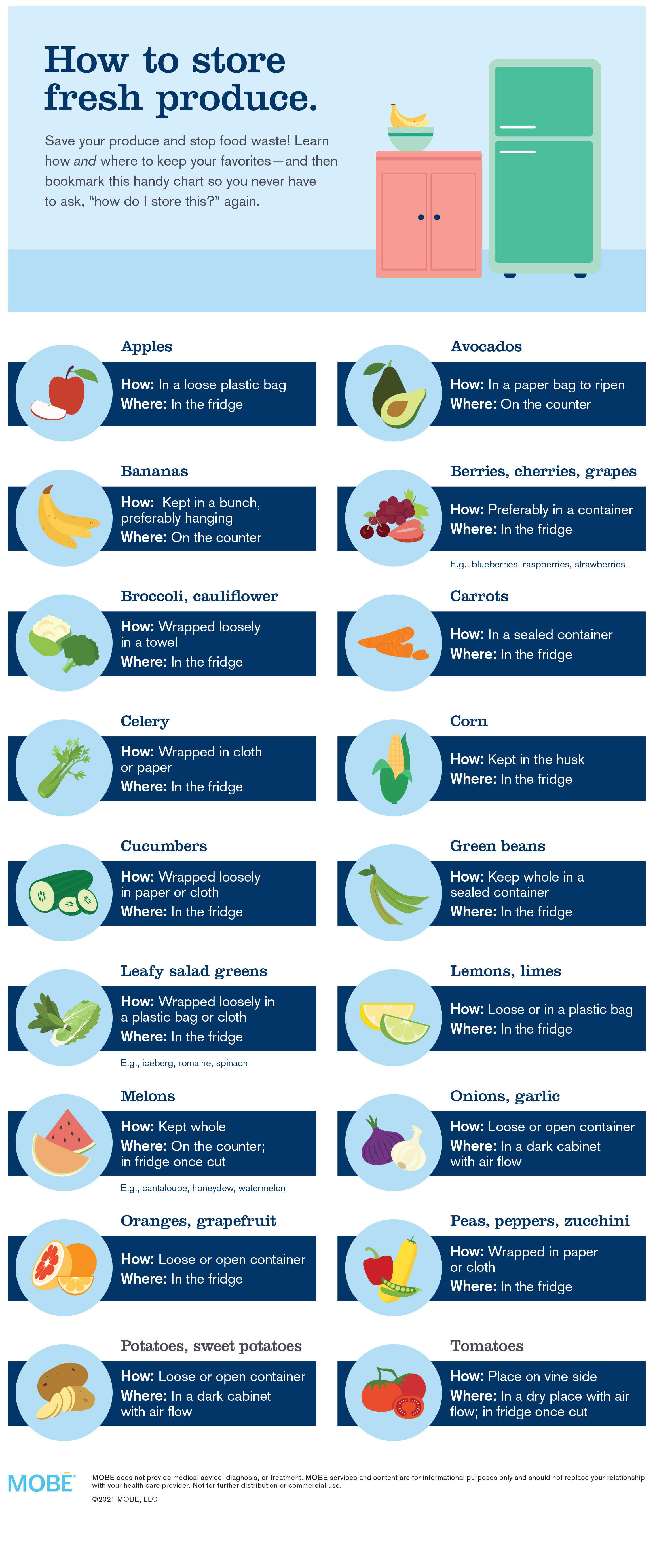 Fruits and vegetables are often stored improperly, making them turn quicker than they need to—wasting food and money. There’s a lot that goes into picking the best place to store your produce, including temperature, humidity, and whether it’s whole or not, but this colorful chart lays out all the facts.